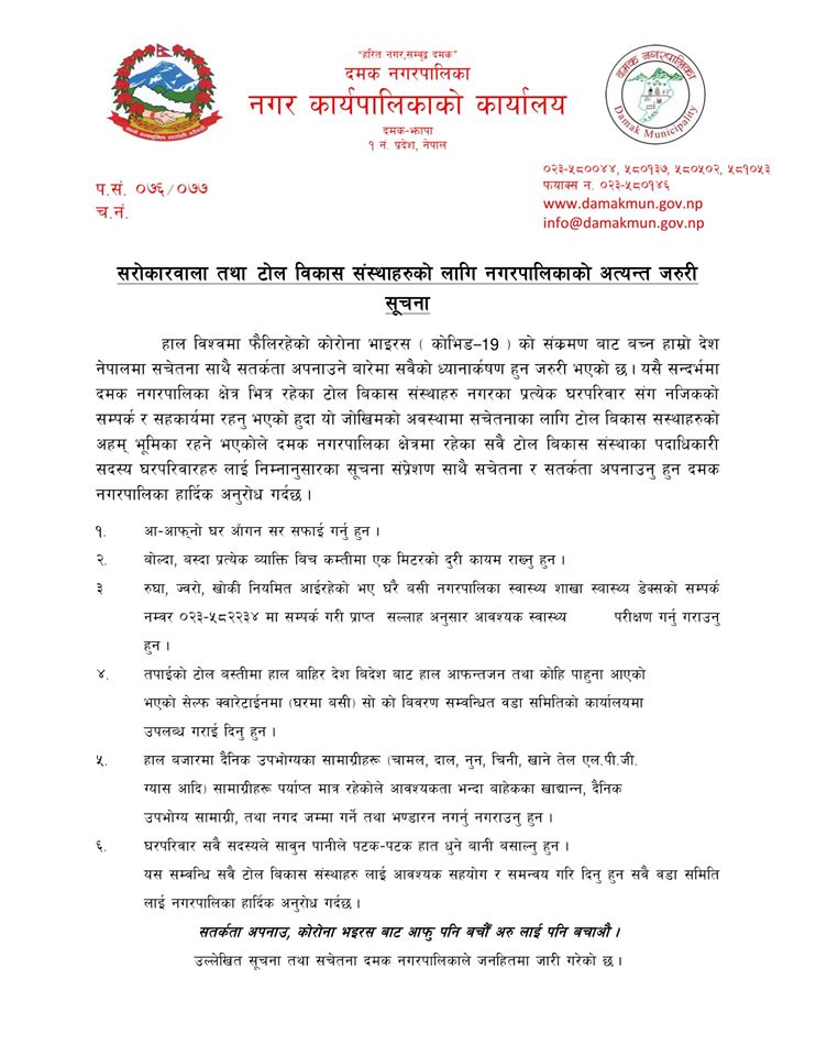 कोरोना र डेंगुबाट बच्न र बचाउनका लागि दमक नगरपालिकाले जारी गर्यो सूचना